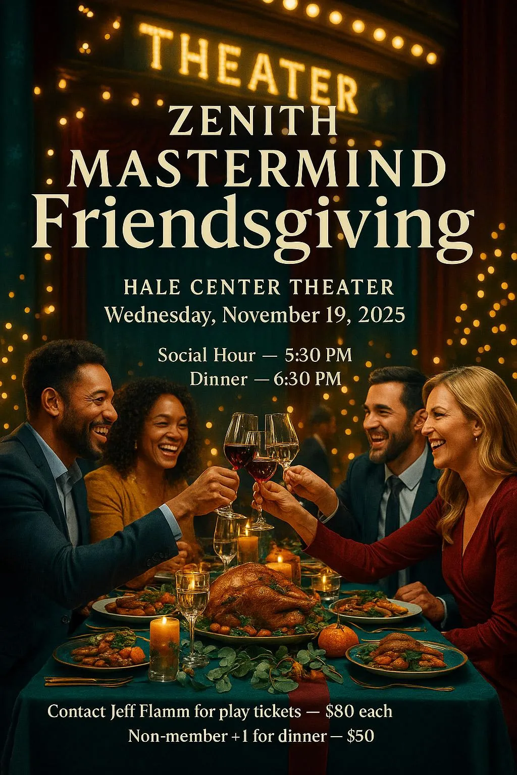 Celebrate the spirit of togetherness at our FRIENDSGIVING Talent Show and Dinner on November 19th, hosted at the enchanting Hale Centre Theatre Fireplace Lounge on the mezzanine. From 5:30 pm to 10 pm, we invite you to join us for an evening of warmth, camaraderie, and inspiration, exclusively for Zenith Mastermind members.